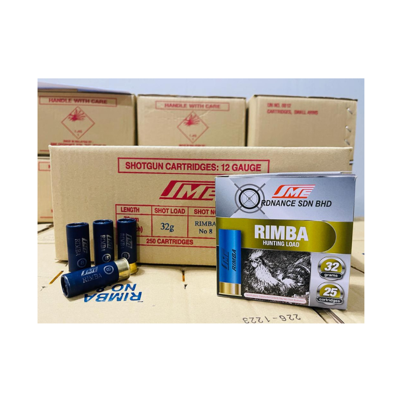 The SME Ordnance (SMEO) Rimba No. 8 is a 12-gauge shotgun cartridge loaded with No. 8 size birdshot. It is a high-precision field load designed for sporting and light hunting, offering a much denser pellet pattern than both the No. 4 and No. 6 variants. This makes it ideal for hunting very small birds and for competitive clay target shooting.